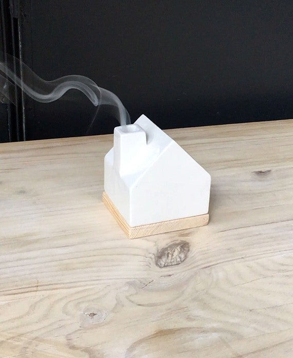 Inciensero realizado artesanalmente en loza cerámica y madera natural. Utilizar conos de incienso colocándolos bajo el agujero de la chimenea. El humo sale a través de la chimenea y aromatiza toda la estancia.