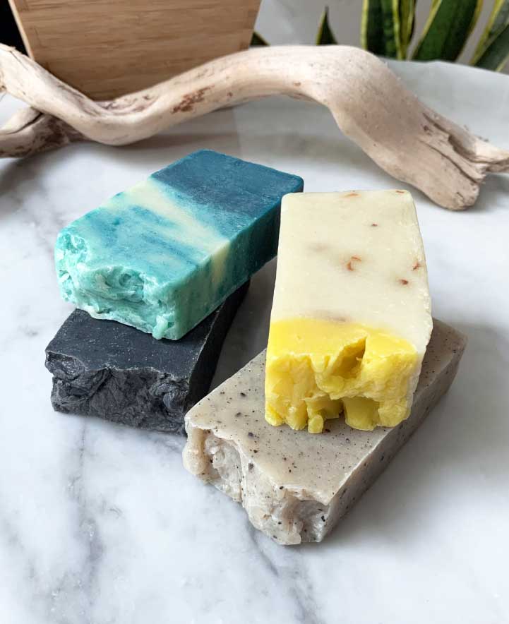 - JABONES ARTESANALES DE ACEITE DE OLIVA de Algas Marinas, Azahar, Avena y Coco y Carbón Activo.